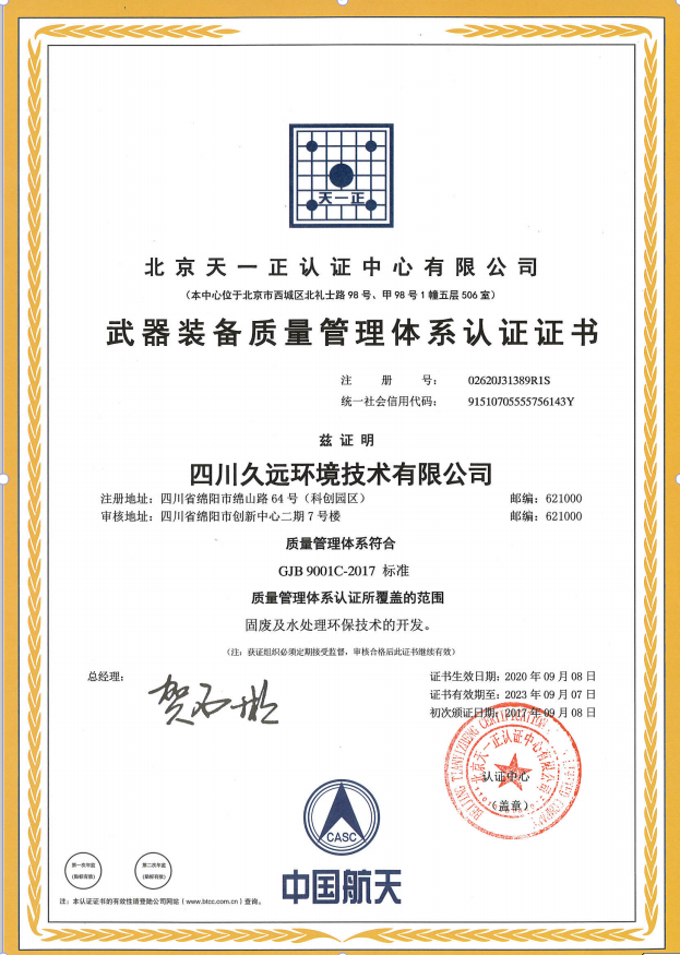 热烈祝贺公司顺利通过武器装备质量管理体系第一次监督审核本次四川久远环境技术有限公司顺利通过审核,表明我公司的质量管理体系符合国家军用标准质量管理体系及相关要求,在ISO系列基础上,公司的质量管理体系更上一层楼,是公司获得的一项重要资质,为公司未来拓展环保领域相关市场打下良好的基础。给我们为环保事业提...